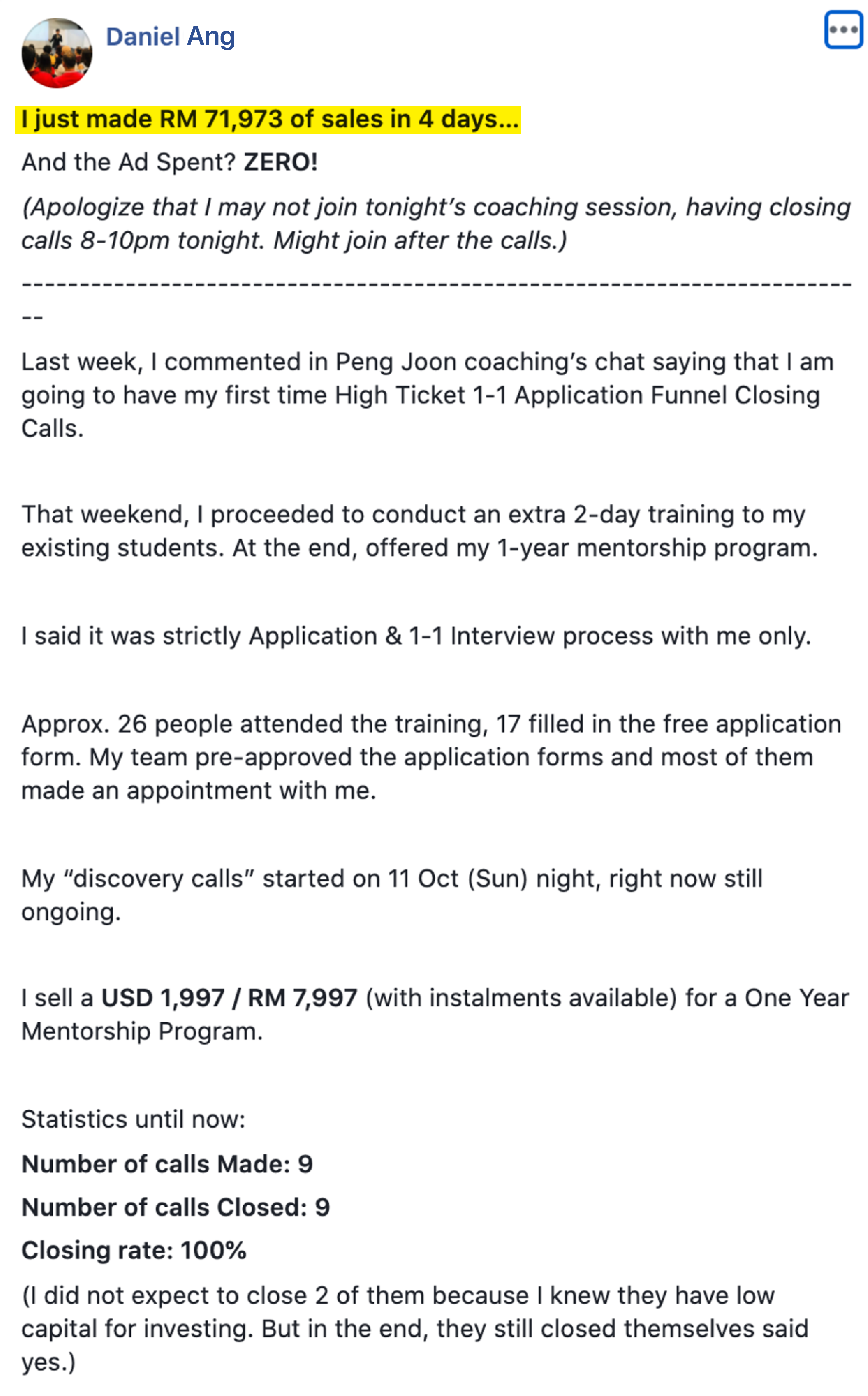 Daniel Closing RM71,973 ($18,000) via Events with No Ad Spend